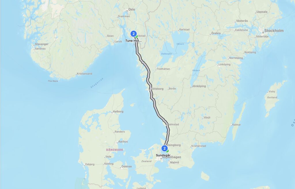 Für den Tag heute Richtung Nordkapp stehen knapp 400km an. Ziel ist das Tune Hotell Sarpsborg Nähe Fredrikstad.