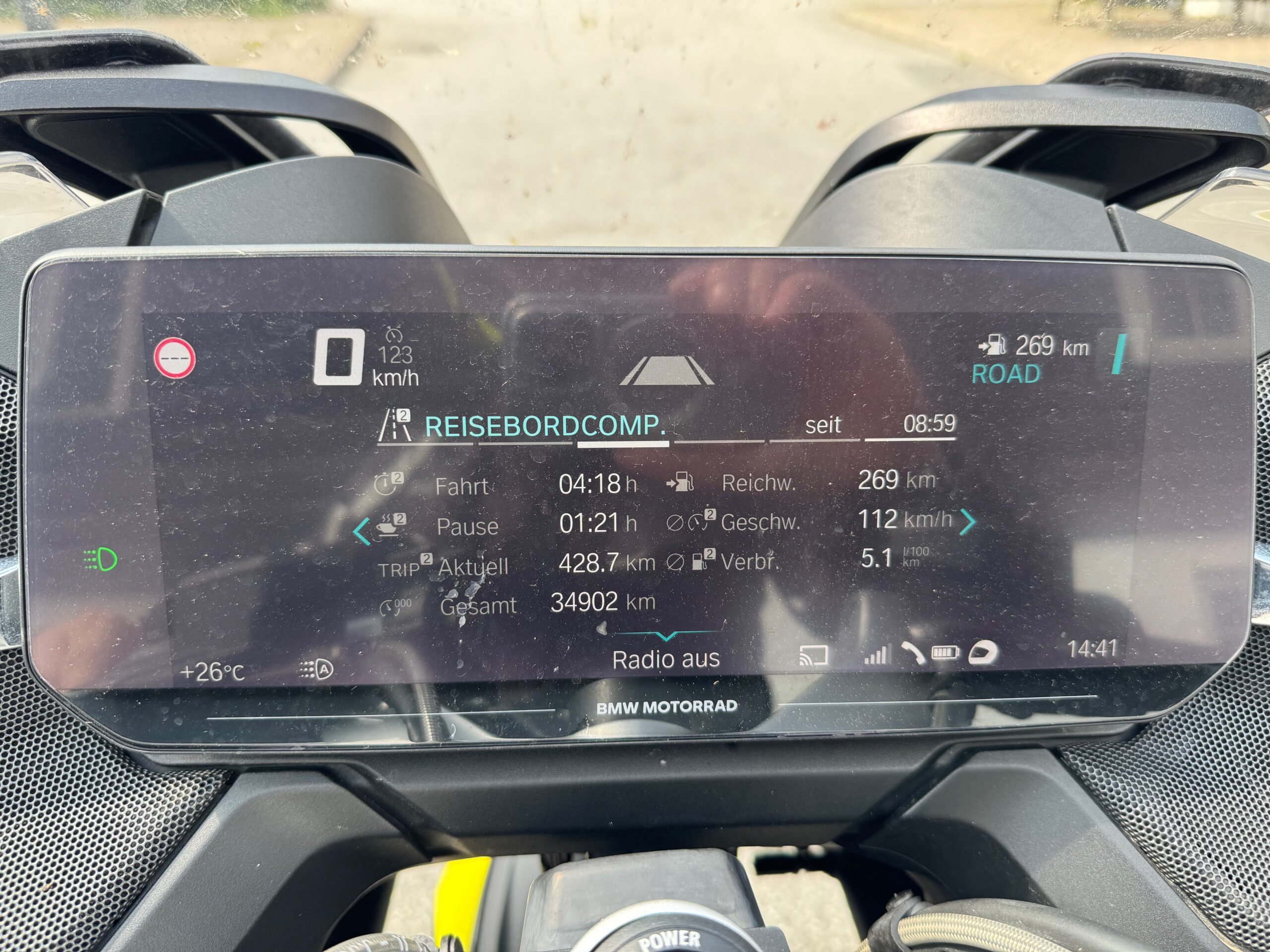 Der Weg zum Hotel war einfach. Sowohl von der Strecke als auch von der Anstrengung. Auf den letzten knapp 100km stieg die Temperatur dann noch auf knallige 27/28 Grad. Zum Glück hatte ich die Regenhose schon bei Zeiten beim ersten Tankstopp ausgezogen.